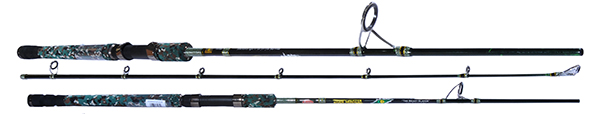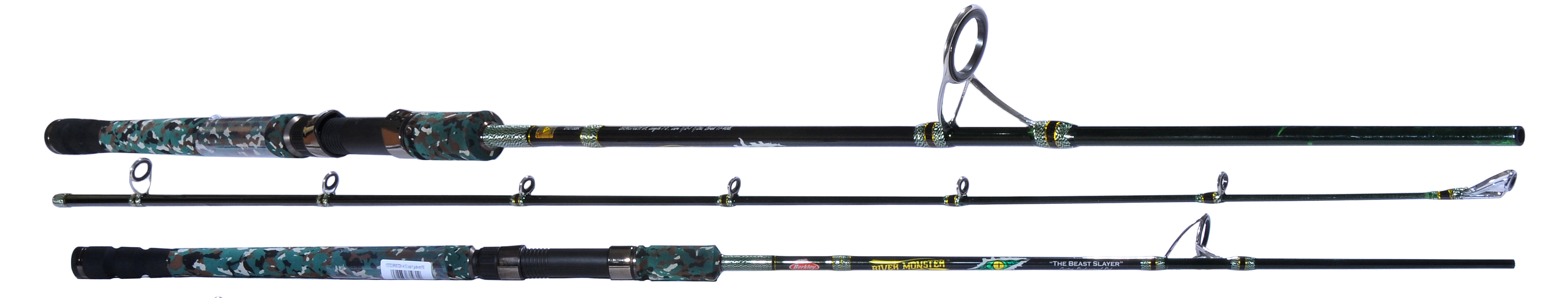 The Berkley River Monster fishing rods certainly look like military arsenal. They come in green (pearl green perhaps) coloured blank that changes colour depending on the reflection of lights, and camouflage EVA + a tad of black EVA at the end.